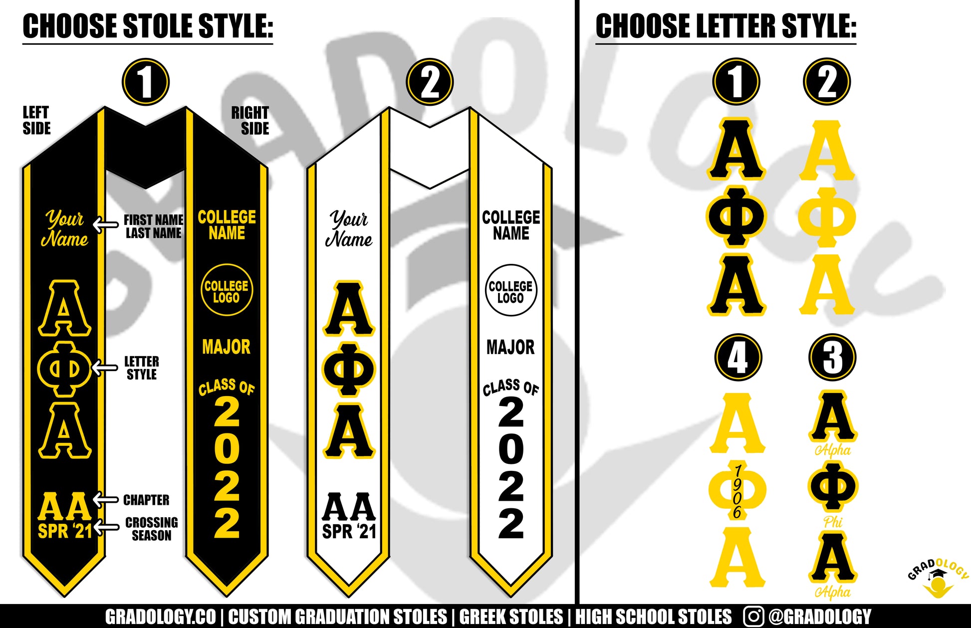 Predesigned greek graduation stole available in satin or glitter. Please fill out the form below and double check all information. University logos are chosen by Gradology. All fonts & texts colors will be the same as the layout design and CAN'T be changed. Add on's are placed based upon where they best fit on the stole. Please allow 2 business days to receive your stole draft.