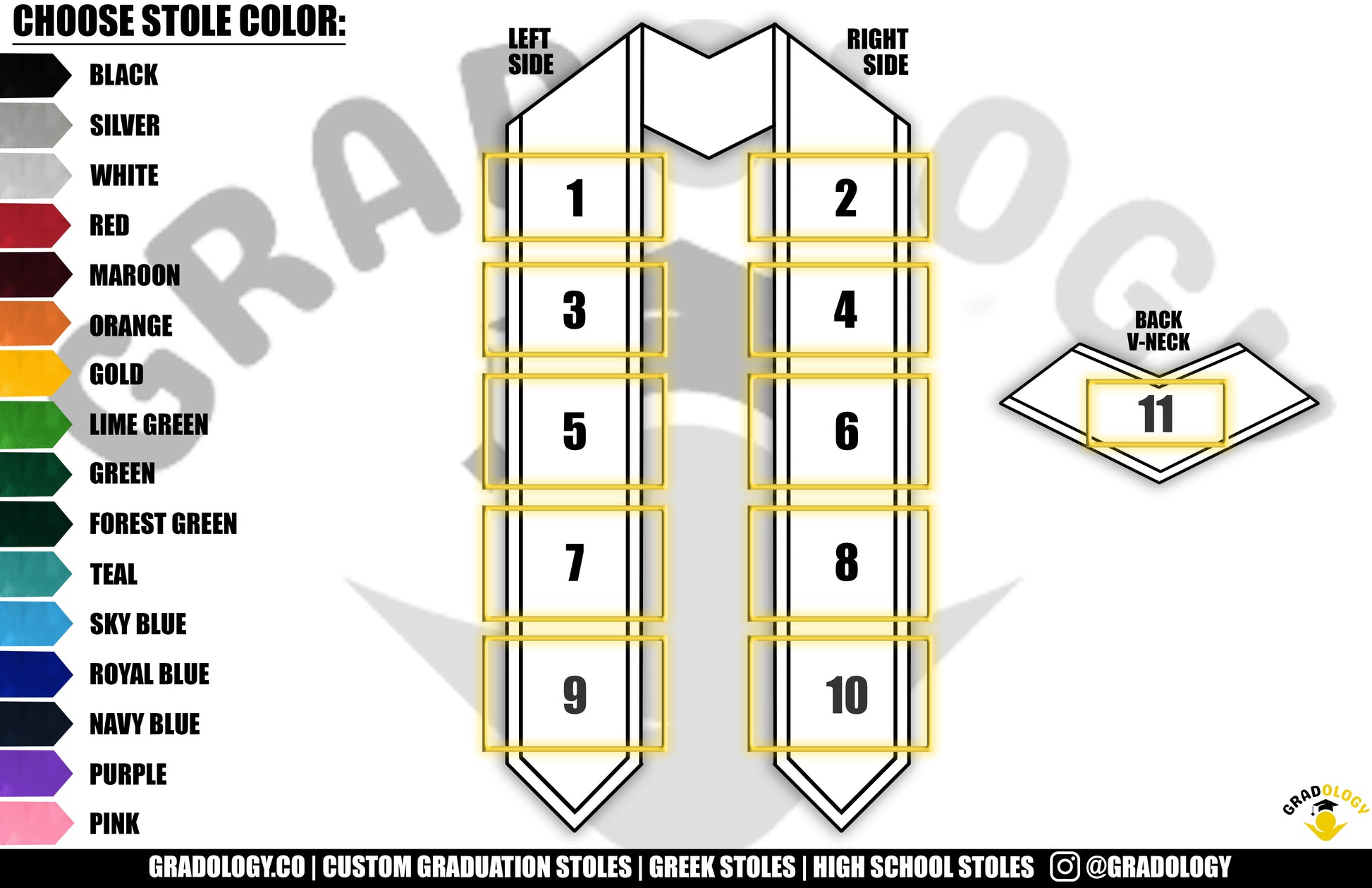Please download the custom stole template, design your stole and upload it to the stole submission form below. Some things you can include on you stole are: university, university logo, graduation year, greek organizations, name, honors, major, major icon, minor, quote, bible verse, organization logo, "In loving memory of...", flag, future career plans, business logo, cartoon graphic, etc. Check out our gallery or Instagram page for inspiration!